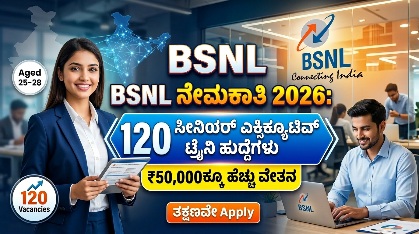 BSNL ನೇಮಕಾತಿ 2026: 120 ಸೀನಿಯರ್ ಎಕ್ಸಿಕ್ಯುಟಿವ್ ಟ್ರೈನಿ ಹುದ್ದೆಗಳು – ₹50,000ಕ್ಕೂ ಹೆಚ್ಚು ವೇತನ