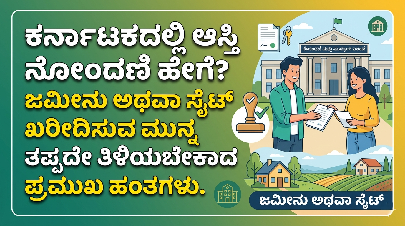ಈ ಕಾರಣದಿಂದಾಗಿ ಜಮೀನು ಅಥವಾ ಸೈಟ್ ಖರೀದಿಸುವ ಮುನ್ನ ಆಸ್ತಿ ನೋಂದಣಿ ಪ್ರಕ್ರಿಯೆ ಹೇಗೆ ನಡೆಯುತ್ತದೆ, ಯಾವ ದಾಖಲೆಗಳು ಬೇಕು, ಯಾವ ಹಂತಗಳನ್ನು ಪಾಲಿಸಬೇಕು ಎಂಬುದನ್ನು ತಿಳಿದುಕೊಳ್ಳುವುದು ಬಹಳ ಮುಖ್ಯ.
